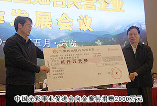 踐行光彩精神,助力老區(qū)發(fā)展。2013年5月9日上午,由中國(guó)光彩事業(yè)促進(jìn)會(huì)、中華全國(guó)工商業(yè)聯(lián)合會(huì)與安徽省人民政府聯(lián)合舉辦的“中國(guó)光彩事業(yè)六安行暨安徽省與全國(guó)知名民營(yíng)企業(yè)合作發(fā)展會(huì)議”在安徽省六安市召開。本次大會(huì)旨在光大光彩事業(yè)、搭建合作平臺(tái),推進(jìn)大別山片區(qū)扶貧攻堅(jiān),深化安徽與全國(guó)知名民營(yíng)企業(yè)合作。會(huì)上,中國(guó)光彩事業(yè)促進(jìn)會(huì)現(xiàn)場(chǎng)向金寨縣捐贈(zèng)2000萬元,全省各地市與多家企業(yè)現(xiàn)場(chǎng)集中簽約項(xiàng)目228個(gè),投資規(guī)模3485億元。