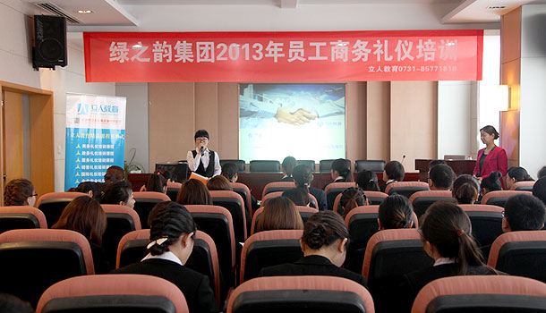 2013年4月27日—28日,綠之韻集團(tuán)聯(lián)合長(zhǎng)沙立人教育組織全體員工開展了為期兩天的“凝心聚力、團(tuán)結(jié)奮進(jìn)”員工拓展訓(xùn)練營(yíng)活動(dòng)。此次活動(dòng),分為全員商務(wù)禮儀培訓(xùn)會(huì)和戶外拓展訓(xùn)練兩個(gè)階段進(jìn)行。27日,為豐富員工的業(yè)余生活,進(jìn)一步提升員工形象氣質(zhì),展示員工積極向上的精神風(fēng)貌,綠之韻集團(tuán)2013年員工商務(wù)禮儀培訓(xùn)會(huì)在集團(tuán)總部六樓會(huì)議廳舉行,國(guó)際高級(jí)禮儀培訓(xùn)師周曉莉?yàn)槿w員工作了“有‘禮’走遍天下”講座,系統(tǒng)地講授了儀容、儀表、氣質(zhì)提升、人際溝通技巧、餐宴禮儀等知識(shí),員工受益匪淺,反響強(qiáng)烈。