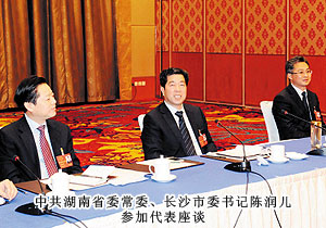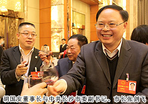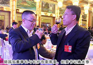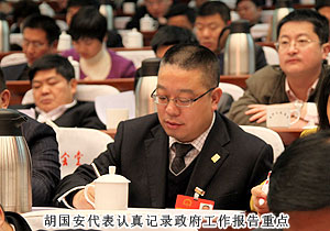 “今天聆聽了政府工作報告,報告內(nèi)容凝練。每個數(shù)字都有力地彰顯出長沙發(fā)展的速度,令我感到十分振奮?!焙鷩泊碓诮邮荛L沙新聞頻道記者采訪中表示。開幕式后,省委常委、市委書記陳潤兒,市委副書記、市長張劍飛一行來到各地區(qū)代表團(tuán),與出席市十四屆人大一次會議的代表們一起審議政府工作報告,聽取代表們的建議和意見。感受身邊的巨變,暢談過去五年的成績,代表們一致認(rèn)為報告分析形勢客觀到位,總結(jié)成績實(shí)事求是。報告主題突出,高屋建瓴,準(zhǔn)確的數(shù)字具有很強(qiáng)的說服力,具體的目標(biāo)體現(xiàn)著政府求真務(wù)實(shí)的作風(fēng),清晰的思路昭示著長沙的美好未來。會上,就2013年長沙經(jīng)濟(jì)社會如何保持平穩(wěn)快速發(fā)展,代表們紛紛獻(xiàn)計獻(xiàn)策。陳潤兒書記、張劍飛市長分別帶領(lǐng)長沙市領(lǐng)導(dǎo)成員與委員們共同協(xié)商討論,仔細(xì)傾聽每位代表發(fā)言,認(rèn)真記錄,還不時一起探討。作為長沙國家生物產(chǎn)業(yè)園代表,胡國安代表在分組報告中對園區(qū)2012年取得的成績作了詳細(xì)匯報。并提出“加快四化兩型建設(shè),以非公經(jīng)濟(jì)促進(jìn)城鄉(xiāng)一體化進(jìn)程,加大對實(shí)體經(jīng)濟(jì)支持力度,踐行實(shí)業(yè)強(qiáng)市、實(shí)業(yè)強(qiáng)省、實(shí)業(yè)強(qiáng)國之路”的建議。同時,針對政府報告中提到的:建設(shè)生態(tài)長沙、精美長沙,推進(jìn)“沿江建設(shè)、跨江發(fā)展”,以及積極推進(jìn)以瀏陽河九道灣為品牌;完善湘江生態(tài)經(jīng)濟(jì)帶,打造“瀏陽河九道灣”品牌,規(guī)劃改造撈刀河、溈水河、靳江河、圭塘河風(fēng)光帶等宜居都市的政府規(guī)劃,胡國安代表結(jié)合園區(qū)、綠之韻集團(tuán)實(shí)際,詳盡闡述了綠之韻集團(tuán)的綠色經(jīng)濟(jì)發(fā)展思路,以及在瀏陽河與撈刀河畔建立生態(tài)休閑區(qū)、建立五星級生態(tài)酒店、別墅群等未來發(fā)展規(guī)劃。陳潤兒書記認(rèn)真聆聽胡國安代表的發(fā)言,邊聽邊記,對發(fā)言中提及的思路和建議表示高度的肯定。陳書記在胡國安代表發(fā)言后說,黨的“十八大”將城鄉(xiāng)一體化與實(shí)業(yè)興國作為重點(diǎn)工作,我們要大膽推進(jìn)改革,釋放發(fā)展活力,政府的權(quán)力要?dú)w位,服務(wù)要到位,進(jìn)一步加大對實(shí)體經(jīng)濟(jì)發(fā)展的支持力度。