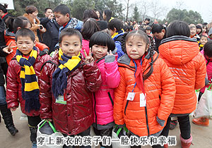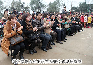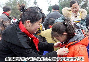 隨后,綠之韻集團董事、常務副總裁勞嘉和綠之韻20名愛心經(jīng)銷商、愛心慈善大使一起為貧困學生們穿上嶄新的冬衣、發(fā)放學習用品。盡管操場上寒風簌簌,可領取到滿載著愛心的嶄新冬衣后,孩子們每個人的臉上都綻放出著歡樂和幸福的笑容。綠之韻濃縮著溫情的冬衣帶給莘莘學子的不只是暖意,在這樣一個充滿著奉獻與感恩的冬天,更多的愛心正在萌發(fā)、生長和茁壯。