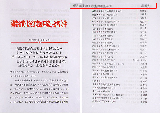 2012年2月7日,由湖南省委省政府、省紀(jì)委、省監(jiān)察廳、省優(yōu)化辦聯(lián)合組織的湖南省機(jī)關(guān)效能建設(shè)和優(yōu)化經(jīng)濟(jì)發(fā)展環(huán)境監(jiān)督測(cè)評(píng)站點(diǎn)員工作會(huì)議在湖南賓館成功召開(kāi)。中共湖南省委常委、省紀(jì)委書記黃建國(guó)、湖南省人民政府副省長(zhǎng)何報(bào)翔等出席會(huì)議。會(huì)議期間聘請(qǐng)了新一屆監(jiān)督測(cè)評(píng)站、點(diǎn)、員,綠之韻集團(tuán)受聘為監(jiān)督測(cè)評(píng)點(diǎn),胡國(guó)安董事長(zhǎng)受聘為監(jiān)督測(cè)評(píng)員,在2011—2014年間,將全面參與對(duì)全湖南省機(jī)關(guān)效能建設(shè)和優(yōu)化經(jīng)濟(jì)發(fā)展環(huán)境的監(jiān)督測(cè)評(píng)。