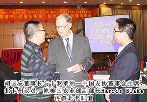 為落實(shí)周強(qiáng)書(shū)記在北京出席中美州長(zhǎng)對(duì)話會(huì)議關(guān)于“開(kāi)創(chuàng)中美省州地方合作新未來(lái)”的精神,推進(jìn)湖南與北卡州簽訂的友好省州協(xié)議內(nèi)容,促進(jìn)湖南與北卡州全面開(kāi)展民間經(jīng)濟(jì)外交,2011年10月20日下午,長(zhǎng)沙—美國(guó)中小企業(yè)合作周(長(zhǎng)沙)項(xiàng)目對(duì)接洽談會(huì)在華天大酒店召開(kāi),由卡羅萊納—中國(guó)友協(xié)董事會(huì)主席,北卡州議員,原美國(guó)農(nóng)業(yè)部副部長(zhǎng)Harris Blake為團(tuán)長(zhǎng)率領(lǐng)的美國(guó)北卡經(jīng)貿(mào)及友好交流訪問(wèn)團(tuán)成員來(lái)長(zhǎng)與長(zhǎng)沙企業(yè)家對(duì)接洽談。長(zhǎng)沙市政協(xié)副主席、市工商聯(lián)主席彭繼球,市僑聯(lián)副主席翁少蘭等領(lǐng)導(dǎo)出席了對(duì)接洽談。繼九月訪美赴北卡州考察與美方企業(yè)有過(guò)初步對(duì)接后,此次綠之韻集團(tuán)胡國(guó)安董事長(zhǎng)再次應(yīng)邀出席合作洽談會(huì)并對(duì)北卡州龐達(dá)地產(chǎn)總裁Mark Herman想建第一座中國(guó)城的項(xiàng)目積極關(guān)注。