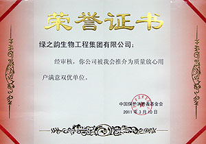 2011年“3?15”國際保護消費者權(quán)益日之際,中國保護消費者基金會根據(jù)《消費者權(quán)益保護法》所賦予的職能和職責(zé),以“誠信、維權(quán)”為年度消費主題而組織的“全國市場放心消費單位”評比活動揭榜。綠之韻集團認(rèn)真貫徹執(zhí)行《消費者權(quán)益保護法》、《產(chǎn)品質(zhì)量法》,嚴(yán)格按照國家的行業(yè)規(guī)定與質(zhì)量標(biāo)準(zhǔn)組織生產(chǎn),經(jīng)過活動組織方及國家相關(guān)部門的層層審查,被中國保護消費者基金會授予“全國市場放心消費單位”。