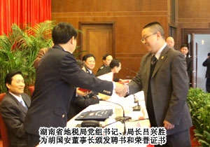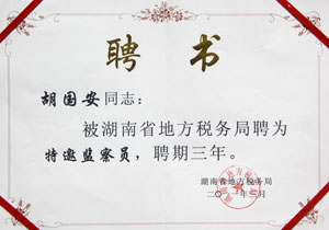 自2008年受聘湖南地稅局特邀監(jiān)查員以來,胡國(guó)安董事長(zhǎng)認(rèn)真履行職責(zé),了解和反映基層稅務(wù)部門和稅務(wù)人員依法治稅、依法行政的情況,在解決群眾關(guān)心的熱點(diǎn)難點(diǎn)問題,促進(jìn)行風(fēng)政風(fēng)建設(shè)方面取得了良好的效果,得到了地稅系統(tǒng)領(lǐng)導(dǎo)的一致好評(píng)。此次會(huì)議,胡國(guó)安董事長(zhǎng)成唯一受聘連任湖南省地稅特邀監(jiān)察員的企業(yè)家。省地稅局黨組書記、局長(zhǎng)呂興勝親自頒發(fā)了聘書和榮譽(yù)證書,并勉勵(lì)胡國(guó)安董事長(zhǎng)認(rèn)真履行職責(zé),積極開展工作,進(jìn)一步加大監(jiān)督力度,為我省黨風(fēng)廉政建設(shè)、優(yōu)化經(jīng)濟(jì)發(fā)展環(huán)境作貢獻(xiàn)。