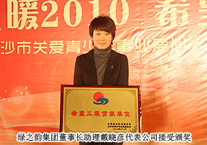 2010年12月30日,由共青團(tuán)長沙市委、長沙市青少年發(fā)展基金會、市青年聯(lián)合會、市青年企業(yè)家協(xié)會等聯(lián)合主辦的“溫暖2010、希望2011”長沙市關(guān)愛青少年事業(yè)愛心人士嘉年華晚會在愛與感恩中舉行。湖南省軍區(qū)原副政委、省關(guān)工委副主任黃祖示,團(tuán)省委副書記馮海燕,市委常委、副市長張迎龍、共青團(tuán)長沙市委書記候文等出席晚會。綠之韻集團(tuán)作為湖南愛心企業(yè)代表受邀出席此次會議并榮獲“希望工程貢獻(xiàn)單位”。