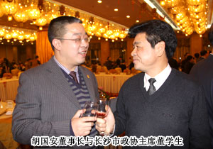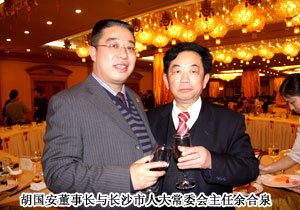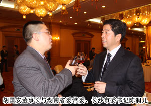 隨后,由中共長(zhǎng)沙市委、市人民政府主辦,長(zhǎng)沙市工商聯(lián)、市總商會(huì)承辦的“長(zhǎng)沙市工商界人士迎春酒會(huì)”在通程國(guó)際大酒店舉行,中共長(zhǎng)沙市委副書記、市人民政府市長(zhǎng)張劍飛主持酒會(huì)。中共湖南省委常委、長(zhǎng)沙市委書記陳潤(rùn)兒,省政協(xié)副主席、省工商聯(lián)主席何報(bào)翔等領(lǐng)導(dǎo)與來自省會(huì)長(zhǎng)沙工商界的500余名企業(yè)家歡聚一堂,共敘友誼,共謀發(fā)展。胡國(guó)安董事長(zhǎng)作為優(yōu)秀企業(yè)家、長(zhǎng)沙市工商聯(lián)(總商會(huì))副會(huì)長(zhǎng)向陳潤(rùn)兒書記以及張劍飛市長(zhǎng)等領(lǐng)導(dǎo)親切交流并匯報(bào)工作情況。