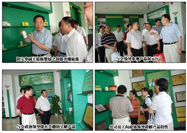 會議圓滿結(jié)束后,胡國安董事長陪同與會的政協(xié)領導參觀了綠之韻標準形像店的展示廳,大家對品種繁多的綠之韻產(chǎn)品和琳瑯滿目的各項榮譽獎牌嘖嘖稱嘆,特別是陽寶華副主席向大家大力推薦起他所熟知并一直在服用的綠之韻銀杏螺旋藻片,連聲稱贊這是保健的好產(chǎn)品。同時,各位政協(xié)領導也對綠之韻集團全力配合省政協(xié)開好這次會議所做的工作給予了高度肯定和贊揚,對胡國安董事長領導下的綠之韻公司未來的發(fā)展表示關注和支持。