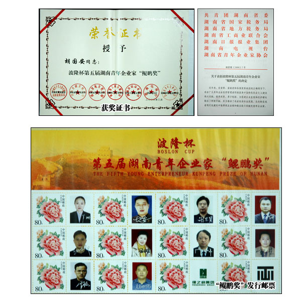2008年3月30日,由共青團湖南省委、湖南省國家稅務局、湖南省地方稅務局、湖南省工商業(yè)聯(lián)合會、湖南日報報業(yè)集團、湖南電視臺、湖南省青年企業(yè)家協(xié)會聯(lián)合主辦的波隆杯第五屆湖南青年企業(yè)家“鯤鵬獎”頒獎典禮在2008全省城市共青團工作主題活動推動會議上隆重舉行。湖南省政協(xié)副主席龍國鍵、共青團湖南省委書記李暉等領導出席了此次會議,共青團省委副書記郭建群主持會議。綠之韻集團董事長兼總裁胡國安先生榮獲“鯤鵬獎”殊榮,受邀出席此次頒獎典禮并接受頒獎。
