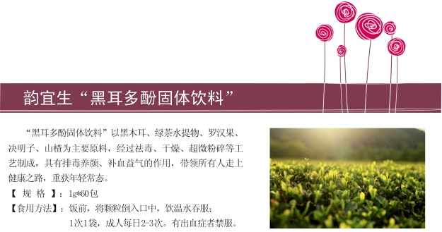 “黒耳多酚固體飲料”中的黑木耳被譽為“素中之王”,是補血的良藥。黒耳多酚中所含的茶多酚能夠阻擋紫外線和清除紫外線誘導(dǎo)的自由基,從而保護(hù)黑色素細(xì)胞的正常功能,抑制黑色素的形成,使肌膚顯得白嫩起來。同時,茶多酚對脂質(zhì)氧化產(chǎn)生抑制作用,減輕色素沉著,延緩機(jī)體衰老。