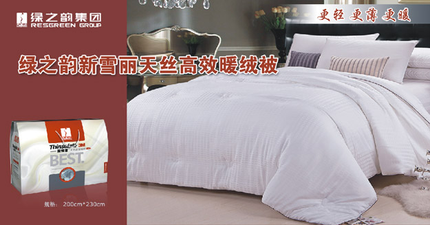 綠之韻集團(tuán)與世界500強(qiáng)企業(yè)3M公司強(qiáng)強(qiáng)聯(lián)手推出高科技被芯——綠之韻新雪麗天絲高效暖絨被。此款被芯使用的是市場(chǎng)上熱重效率最高的合成保溫材料,利用被芯形成具有高吸附空氣性能的空間結(jié)構(gòu),從而阻止人體熱量通過空氣對(duì)流散失,同時(shí)反射回大部分的人體熱輻射,這樣就保障了人體熱量盡可能少的損失。且3M公司的新雪麗保溫材料就是為了可以承受地球上最苛刻的環(huán)境條件才研制出來的,因此從它誕生起就比一般的保溫材料更保暖。實(shí)驗(yàn)證明,在相同重量的情況下,要多550克羽絨作為填充料,才能達(dá)到這樣一款新雪麗暖絨被的保暖效果,這也直接解決冬天蓋被臃腫的難題。
