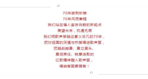 為慶祝新中國成立70周年,2019年9月29日,綠之韻集團舉行國慶升旗儀式暨拉紅歌大賽,共同祝愿我們偉大的祖國繁榮昌盛、安定富強。綠之韻集團董事長胡國安、董事總裁勞嘉攜公司高管及全體員工參加活動。