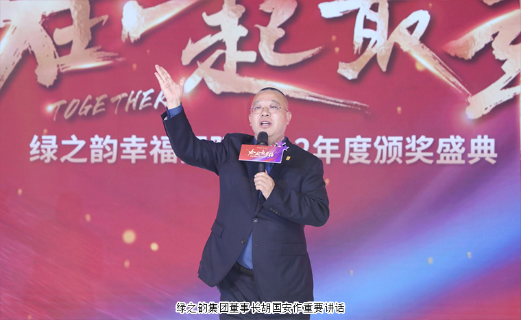 “路雖遠(yuǎn),行必至,事雖難,做必成”,大會最后,在全場最為熱烈的掌聲中,綠之韻集團(tuán)董事長胡國安上臺向所有幸福代言人贈寄語牌匾,并講話。他首先向大會現(xiàn)場以及通過在線互動視頻觀看本次大會盛況的綠之韻家人致以熱烈的歡迎和誠摯的問候,并向每一位獲獎?wù)弑硎緹崃业淖YR。他表示,感謝每一位奮斗的幸福代言人,三年來,你們不畏艱難、不辭辛勞、不懼疫情,用不同形式,在不同地點(diǎn),全力的傳播著公司的企業(yè)文化,傳承中華五千年養(yǎng)生文化,積極推動科技讓中醫(yī)養(yǎng)生走進(jìn)千家萬戶的理念,為你們點(diǎn)贊!向所有的幸福代言人致敬!你們奮斗的身影,是2022最美的風(fēng)景!回看來路,繁花似錦;瞻望前程,乘風(fēng)鼓翼。乘著黨的二十大與兩會勝利召開的浩蕩東風(fēng),我們滿懷激情的跨入充滿希望的2023年。在一起,最幸福,伴著市場環(huán)境加速回暖、營商環(huán)境持續(xù)優(yōu)化的鏗鏘足音,未來三年,在集團(tuán)公司的全力支持下,在現(xiàn)場每一位和通過視頻收看的綠之韻家人的支持下,我們一定能在新起點(diǎn)上再創(chuàng)新輝煌!