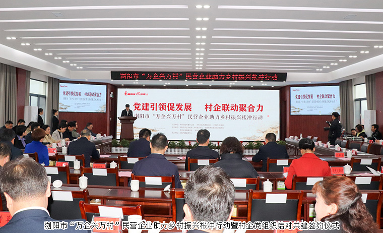 黨建引領(lǐng)促發(fā)展,村企聯(lián)動(dòng)聚合力。2023年3月23日,瀏陽市“萬企興萬村”民營企業(yè)助力鄉(xiāng)村振興棖沖行動(dòng)暨村企黨組織結(jié)對(duì)共建簽約儀式在瀏陽市棖沖鎮(zhèn)舉行。中共瀏陽市委副書記、統(tǒng)戰(zhàn)部部長(zhǎng)戴武明,中共瀏陽市委常委、組織部部長(zhǎng)唐安石,中共瀏陽市委常委、市委辦主任王坤球,瀏陽市人大常委會(huì)黨組成員、副主任唐洪勝,瀏陽市人民政府副市長(zhǎng)劉來宏,瀏陽市政協(xié)副主席、市工商聯(lián)主席陳靜等領(lǐng)導(dǎo)出席活動(dòng)。瀏陽市相關(guān)單位和部門負(fù)責(zé)人,棖沖鎮(zhèn)全體黨政領(lǐng)導(dǎo),村黨總支書記、主任,鄉(xiāng)村振興駐村第一書記以及結(jié)對(duì)幫扶企業(yè)代表參加活動(dòng)。綠之韻集團(tuán)黨委書記劉云代表公司受邀參加活動(dòng)。