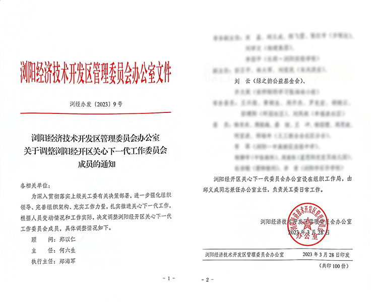 2023年3月31日,瀏陽經(jīng)濟(jì)技術(shù)開發(fā)區(qū)召開關(guān)心下一代工作推進(jìn)會,學(xué)習(xí)貫徹中辦國辦《關(guān)于加強(qiáng)新時代關(guān)心下一代工作委員會工作的意見》及省委辦省政府辦《關(guān)于加強(qiáng)新時代關(guān)心下一代工作委員會工作的實施意見》,回顧總結(jié)2022年工作,安排部署2023年重點任務(wù)。長沙市關(guān)工委常務(wù)副主任盧鴻鳴,瀏陽市關(guān)工委主任劉一江,瀏陽經(jīng)開區(qū)黨工委委員、管委會副主任、關(guān)工委主任何六生,瀏陽經(jīng)開區(qū)關(guān)工委執(zhí)行主任鄭海軍,瀏陽經(jīng)開區(qū)組織工作局局長、關(guān)工委常務(wù)副主任宋孟等領(lǐng)導(dǎo)出席會議。綠之韻集團(tuán)黨委書記、綠之韻公益基金會副理事長劉云,綠之韻集團(tuán)關(guān)工委主任馮紅參加會議。