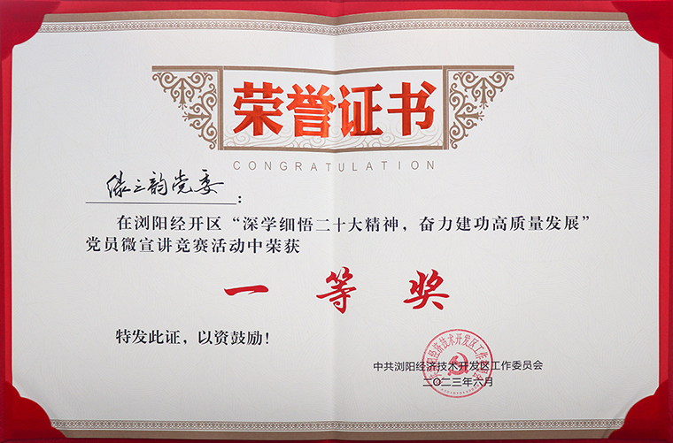 為深入學(xué)習(xí)宣傳貫徹黨的二十大精神,推動(dòng)黨的二十大精神落地見效,落實(shí)省委、市委組織部“一月一課一片一實(shí)踐”活動(dòng)要求,不斷激發(fā)廣大青年黨員干部的榮譽(yù)感、責(zé)任感、使命感,2023年6月21日,瀏陽(yáng)經(jīng)開區(qū)舉辦“深學(xué)細(xì)悟黨的二十大精神,奮力建功園區(qū)高質(zhì)量發(fā)展”黨員微宣講競(jìng)賽活動(dòng)。中共長(zhǎng)沙市委宣傳部副部長(zhǎng)、一級(jí)調(diào)研員唐曙光,瀏陽(yáng)經(jīng)開區(qū)黨工委書記鄭以仁,長(zhǎng)沙市委兩新工委專職副書記肖劍鋒,瀏陽(yáng)經(jīng)開區(qū)黨工委委員、管委會(huì)副主任、企業(yè)黨委書記何六生,區(qū)黨工委委員、紀(jì)工委書記肖賽男等領(lǐng)導(dǎo)出席活動(dòng)。綠之韻集團(tuán)黨委書記劉云、工會(huì)主席馮紅帶領(lǐng)集團(tuán)多名黨員代表參加活動(dòng)。綠之韻集團(tuán)選送的《青春中國(guó)》作品以全場(chǎng)最高分?jǐn)孬@一等獎(jiǎng),向建黨102周年獻(xiàn)禮。