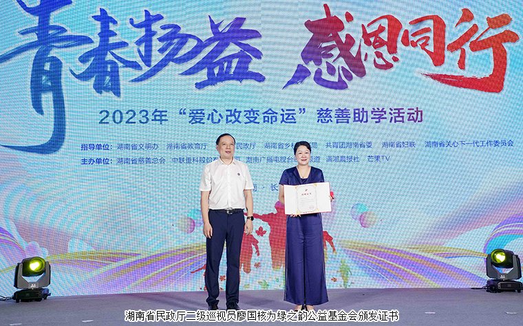 涓涓愛心匯流成河,點點星光照亮未來。愛心企業(yè)、愛心單位線上線下齊發(fā)力。今年7月,綠之韻公益基金會攜手湖南省慈善總會、芒果公益開啟“愛心改變命運”助學季,上線“2023愛心改變命運”網(wǎng)絡(luò)籌款募捐項目,向社會籌措助學資金,資助湖南省內(nèi)勵志學子圓夢大學。此次活動現(xiàn)場,勞嘉理事長代表綠之韻公益基金會向“愛心改變命運”項目捐資20萬,為圓勵志學子大學夢貢獻一份力量。