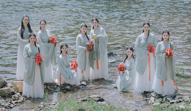 胡國安董事長帶領管理團隊及9位綠韻仙子款款而行、踏水而來