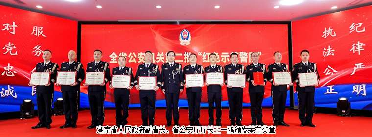 升旗儀式之后,湖南省公安廳舉行第二批“紅色示范警隊”發(fā)布暨從警30年榮譽紀念儀式?,F(xiàn)場觀看了推選宣傳“紅色示范警隊”活動專題片。湖南省公安廳黨委副書記、常務副廳長周賽保宣讀《關于第二批“紅色示范警隊”學習宣傳活動的通報》、《授予“湖南公安榮譽章”的決定》。湖南省人民政府副省長、省公安廳廳長王一鷗為第二批“紅色示范警隊”獲評單位、廳機關從警30周年民警代表頒發(fā)證書、榮譽章?!凹t色示范警隊”在全省公安機關逐步形成紅色警隊雁陣格局和群體效應,為全省公安工作高質(zhì)量發(fā)展提供強大精神動力,已成為湖南公安政治建警的一張“紅色名片”。