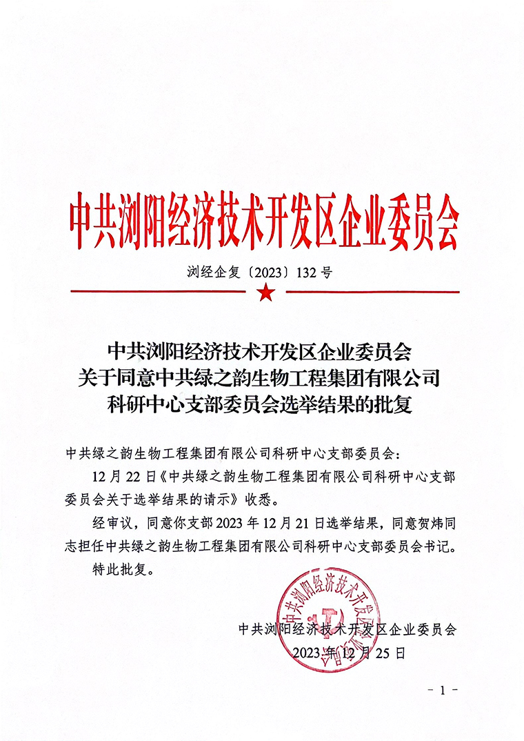 為貫徹落實(shí)黨的二十大精神,進(jìn)一步加強(qiáng)基層黨組織建設(shè),以黨建工作引領(lǐng)科研技術(shù)攻關(guān),充分發(fā)揮黨建工作對(duì)企業(yè)的引領(lǐng)作用,經(jīng)中共瀏陽(yáng)經(jīng)濟(jì)技來(lái)開(kāi)發(fā)區(qū)企業(yè)委員會(huì)批復(fù)同意,中共綠之韻生物工程集團(tuán)有限公司科研中心黨支部正式成立,賀煒同志當(dāng)選為黨支部委員會(huì)書(shū)記。