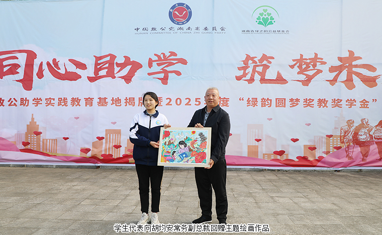 在全場領(lǐng)導(dǎo)嘉賓的見證下,湖南省人大常委會副主任、致公黨省委會主委胡旭晟,中共安化縣委副書記、統(tǒng)戰(zhàn)部部長代虹宇,冷市鎮(zhèn)中心學(xué)校校長張亮,綠之韻集團董事長胡國安共同為“致公助學(xué)實踐教育基地”揭牌,標(biāo)志著安化大橋?qū)W校成為致公黨湖南省委會與綠之韻公益基金會教育幫扶的重要基地,助力安化縣實施鄉(xiāng)村振興文化振興、教育振興。學(xué)生代表向胡國安董事長、胡均安常務(wù)副總裁回贈了精心創(chuàng)作的書法及主題繪畫作品,筆觸間飽含感恩與感激之情。