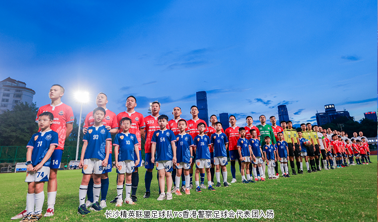 19:30,長沙精英聯(lián)盟足球隊VS香港警察足球會代表團入場式拉開帷幕。國旗飄揚中,球員們牽著球童步入賽場,莊嚴(yán)的國歌奏響,現(xiàn)場氛圍莊重?zé)崃摇iL沙市海外聯(lián)誼會會長劉匯在長沙市足協(xié)主席魏華松陪同下,與首發(fā)球員親切握手并為本場比賽開球,隨著足球踢出,這場備受矚目的比賽正式開啟。