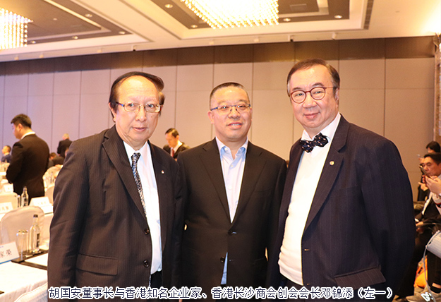 當(dāng)天下午,胡國(guó)安董事長(zhǎng)還受邀參加湖南(香港)現(xiàn)代服務(wù)業(yè)合作推介會(huì)。會(huì)上,湖南省人民政府副省長(zhǎng)何報(bào)翔致辭并作湖南省情推介,香港特別行政區(qū)商務(wù)及經(jīng)濟(jì)發(fā)展局局長(zhǎng)邱騰華致辭,湖南省文旅廳廳長(zhǎng)陳獻(xiàn)春作湖南省文化旅游產(chǎn)業(yè)推介。湖南省商務(wù)廳黨組書記、廳長(zhǎng)徐湘平出席會(huì)議。會(huì)議由湖南省人民政府辦公廳巡視員羅建軍主持。出席本次活動(dòng)的工商界企業(yè)代表共121家,其中500強(qiáng)企業(yè)32家,包括世界500強(qiáng)15家,中國(guó)500強(qiáng)8家、民營(yíng)500強(qiáng)9家。香港貿(mào)發(fā)局、港交所、普華永道會(huì)計(jì)師事務(wù)所、安永會(huì)計(jì)師事務(wù)所、戴德梁行、香港九龍倉(cāng)集團(tuán)、德國(guó)費(fèi)森尤斯、美國(guó)AECOM公司、法國(guó)巴黎銀行、日本瑞穗銀行、和記地產(chǎn)集團(tuán)、中國(guó)長(zhǎng)城、越秀交通、香港中華總商會(huì)、香港中華廠商聯(lián)合會(huì)、香港中國(guó)企業(yè)協(xié)會(huì)、香港工業(yè)總會(huì)、第一太平戴維斯物業(yè)顧問、仲量聯(lián)行等高層均應(yīng)邀到會(huì)。