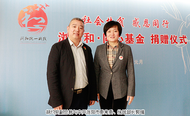 社會扶貧,感恩同行。2019年1月24日,“瀏陽和·同心基金”捐贈座談會在瀏陽市舉行。中共瀏陽市委常委、統(tǒng)戰(zhàn)部長郭瑞,瀏陽市人大常委會副主任、民革瀏陽工委主委劉仙娥,中共瀏陽市委統(tǒng)戰(zhàn)部常務(wù)副部長焦清平,中共瀏陽市委統(tǒng)戰(zhàn)部副部長、工商聯(lián)黨組書記湯建軍,瀏陽市安監(jiān)局黨組書記、局長熊湘東,中共瀏陽市委統(tǒng)戰(zhàn)部副部長、臺辦主任江涵等領(lǐng)導(dǎo)出席活動。瀏陽市委統(tǒng)戰(zhàn)部、市安監(jiān)局、市工商聯(lián)、市紅十字會負責人等參加活動。會上,“瀏陽和·同心基金”溫暖成立,綠之韻集團捐資10萬為愛聚力,綠之韻集團副總裁胡均安參加捐贈儀式。