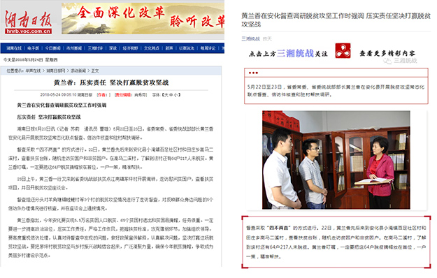 2018年5月22—23日,中共湖南省委常委、省委統(tǒng)戰(zhàn)部部長黃蘭香一行赴湖南安化開展脫貧攻堅調研工作。本次調研活動圍繞目前安化縣開展脫貧攻堅常態(tài)化聯(lián)點督查和駐村幫扶調研幾大主題進行。調研期間,中共湖南省委常委、省委統(tǒng)戰(zhàn)部部長黃蘭香,省委統(tǒng)戰(zhàn)部副部長龍建湘,省交通運輸廳黨組成員、副廳長曾勝,省水利廳副巡視員楊光鑫,省扶貧辦副巡視員楊文輝,湖南省政協(xié)委員、湖南省工商聯(lián)(總商會)副會長、綠之韻集團董事長胡國安等深入安化縣,實地考察安化縣高馬二溪村、茅坪村脫貧攻堅情況和駐村幫扶工作,慰問貧困戶,并召開專題座談會,調度駐村幫扶工作。中共湖南省益陽市委常委、組織部部長何俊峰,中共安化縣委書記熊哲文等陪同調研。