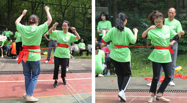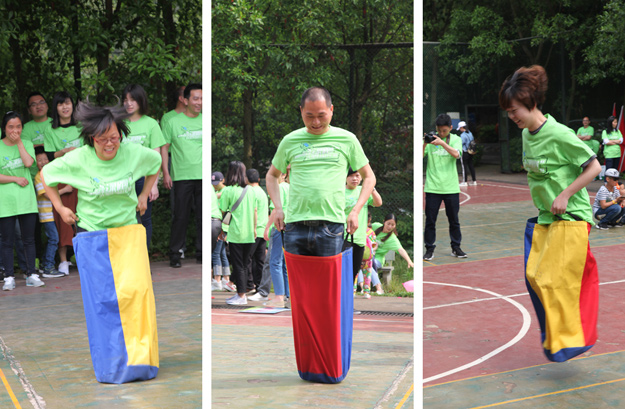 稍作整理后,活動(dòng)組委會(huì)將所有參加活動(dòng)的員工分成了六組,在六個(gè)小組間展開(kāi)了別開(kāi)生面、妙趣橫生的趣味競(jìng)技活動(dòng)。比賽還沒(méi)開(kāi)始,各隊(duì)成員就摩拳擦掌,躍躍欲試?!按筇庇螒蛑?,家人們穿著“袋鼠裝”,哨聲一響,參賽隊(duì)員們使出了渾身解數(shù),有的步伐輕盈輕松而過(guò),有的奮力跳躍磕磕絆絆,有的手忙腳亂摔倒在地……參賽的家人縱情投入,場(chǎng)邊的助威吶喊聲連同歡笑聲此起彼伏,不絕于耳,將活動(dòng)推向一個(gè)又一個(gè)的高潮。