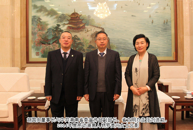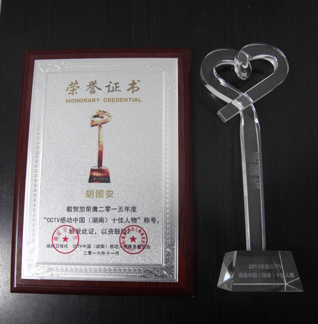 感動(dòng)中國(guó),感動(dòng)湖南。2016年11月9日,由湖南省文明辦指導(dǎo),湖南日?qǐng)?bào)社、省總工會(huì)、省軍區(qū)政治部、團(tuán)省委、省婦聯(lián)共同主辦,三湘都市報(bào)、華聲在線承辦的“2015年度感動(dòng)中國(guó)之感動(dòng)湖南人物”頒獎(jiǎng)典禮在湖南省委九所賓館隆重舉行。湖南省人大常委會(huì)副主任李友志,省人大常委會(huì)委員、教科文衛(wèi)委員會(huì)主任委員梁爾源,中共湖南省委宣傳部副部長(zhǎng)、省文明辦主任劉進(jìn)能,省總工會(huì)黨組成員、副主席黃新民,省婦聯(lián)黨組成員、副主席魯華,湖南日?qǐng)?bào)社黨組成員、副總編輯鄧獻(xiàn)忠,省軍區(qū)轉(zhuǎn)業(yè)辦主任吳湘波,省委宣傳部新聞處處長(zhǎng)馮錦,省文明辦創(chuàng)建處處長(zhǎng)張志輝,湖南日?qǐng)?bào)社編委、三湘都市報(bào)總編輯、華聲在線常務(wù)副總裁張?jiān)茐?mèng),省總工會(huì)宣教部副部長(zhǎng)羅偉,共青團(tuán)湖南省委宣傳部部長(zhǎng)陳麗等出席活動(dòng)。綠之韻集團(tuán)董事長(zhǎng)胡國(guó)安獲評(píng)2015年度“CCTV感動(dòng)中國(guó)(湖南)十佳人物”稱號(hào),中共湖南省委宣傳部副部長(zhǎng)、省文明辦主任劉進(jìn)能為胡國(guó)安董事長(zhǎng)頒獎(jiǎng)。