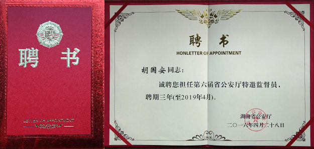 談到再次受聘為湖南省公安廳特邀監(jiān)督員,胡國安董事長表示: 2008年,我首次受聘為湖南省地方稅務(wù)特邀監(jiān)察員,2012年被受聘為湖南省紀(jì)委、省監(jiān)察廳“機(jī)關(guān)效能建設(shè)和優(yōu)化經(jīng)濟(jì)發(fā)展環(huán)境監(jiān)督測評員”,2013年又被受聘為“湖南省公安廳第五屆特邀監(jiān)督員”,對特邀監(jiān)督員這個身份始終葆有一種神圣的使命感和責(zé)任感。這個聘書是沉甸甸的,跟人大代表、政協(xié)委員的身份一樣,不僅是一種光榮,更肩負(fù)著廣大普通民眾的矚托。我一定不辜負(fù)省公安廳黨委的期望,不辜負(fù)廣大民眾的重托,爭做稱職的、優(yōu)秀的監(jiān)督員,并充分發(fā)揮好監(jiān)督、橋梁和參謀作用,為我省公安工作和隊伍建設(shè)做出自己更大的貢獻(xiàn)。