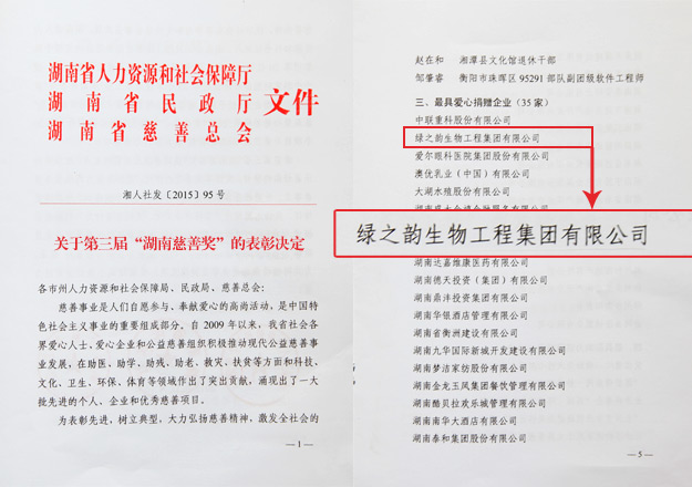 2015年12月18日上午,湖南省慈善總會(huì)第三次會(huì)員代表大會(huì)暨第三屆“湖南慈善獎(jiǎng)”表彰大會(huì)在長沙舉行。中華慈善總會(huì)副會(huì)長李宏塔,中華慈善總會(huì)秘書長邊志偉,湖南省政協(xié)原主席、省慈善總會(huì)第二屆理事會(huì)會(huì)長王克英,湖南省人民政府副省長蔡振紅,湖南省人民政府副秘書長王光明,湖南省民政廳廳長、黨組書記、省社會(huì)組織黨工委書記段林毅,湖南省民政廳巡視員、省社會(huì)組織黨工委副書記李勁夫等出席會(huì)議。會(huì)上,因?yàn)樵诠娲壬剖聵I(yè)中做出的重大貢獻(xiàn),湖南省工商聯(lián)(總商會(huì))副會(huì)長、湖南省光彩事業(yè)促進(jìn)會(huì)副會(huì)長、長沙光彩基金會(huì)理事長、綠之韻集團(tuán)董事長胡國安當(dāng)選湖南省慈善總會(huì)副會(huì)長;綠之韻集團(tuán)被湖南省人力資源和社會(huì)保障廳、省民政廳、省慈善總會(huì)聯(lián)合授予“湖南省慈善獎(jiǎng)最具愛心捐贈(zèng)企業(yè)”殊榮。
