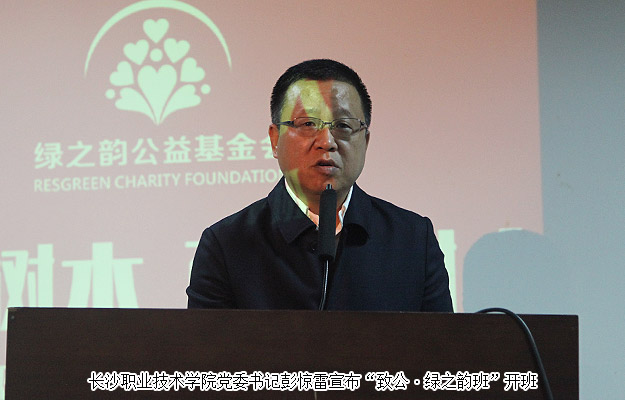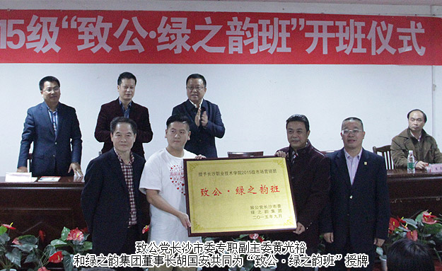 2015年11月3日,由綠之韻集團和致公黨長沙市委聯(lián)合開辦的“致公?綠之韻班”在長沙職業(yè)技術(shù)學(xué)院舉行了開班儀式。致公黨長沙市委專職副主委黃光裕、長沙市教育局副局長楊慶江、致公黨長沙市委秘書長梟燕等出席活動,綠之韻集團董事長胡國安,綠之韻集團辦公室主任、工會副主席馮紅,湖南省綠之韻公益基金會秘書長蔣文,綠之韻集團團委書記李倩婷,湖南分公司副經(jīng)理劉磊及愛心經(jīng)銷黃翔、李政沅、周書明等代表參加開班儀式。長沙職業(yè)技術(shù)學(xué)院黨委書記彭驚雷帶領(lǐng)學(xué)校領(lǐng)導(dǎo)班子成員和“致公?綠之韻班”50多名學(xué)生及部分教師代表參加活動。