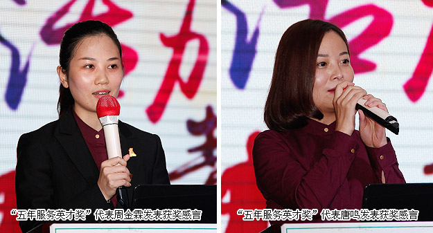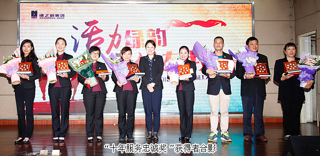 神圣的頒獎(jiǎng)環(huán)節(jié)聚焦了全場的目光,掌聲雷動(dòng),歡呼與尖叫響徹全場!豐收離不開綠之韻全體的辛勤耕耘,輝煌離不開綠之韻人的奮力拼搏。大會(huì)集中頒發(fā)了“三季度優(yōu)秀服務(wù)集體”、“三季度服務(wù)明星”、“五年服務(wù)英才獎(jiǎng)”和“十年服務(wù)忠誠獎(jiǎng)”等獎(jiǎng)項(xiàng)。獲獎(jiǎng)部門代表、個(gè)人依次踏上領(lǐng)獎(jiǎng)臺(tái),享受大家的聲聲祝福和熱烈掌聲,共同分享此時(shí)此刻的快樂。本次表彰會(huì)上,業(yè)務(wù)服務(wù)部、企劃部、山西分公司、保安組喜獲“三季度優(yōu)秀服務(wù)集體獎(jiǎng)”,王壯、姚雅、張海麗、張智皓、程瑤、喻鳴鸞、李翼、夏丹、高芳、張曉芳、楊芳、肖波、楊丹、王小波、湯霞琳、胡樹峰、齊峰雪榮獲“三季度服務(wù)明星”殊榮;張曉芳、周金霖、盛夏、高素丹、彭姣、李倩婷、唐鳴、王小波、鄒建華榮膺“五年服務(wù)英才獎(jiǎng)”,董事常務(wù)副總裁勞嘉上臺(tái)頒發(fā)了香港周大福珠寶公司特約設(shè)計(jì)師量身定做的、鐫刻獲獎(jiǎng)?wù)呙值淖憬饦s譽(yù)徽章和獎(jiǎng)金;肖巧林、蔣文、周瑛、李娟、湛甜、王薇、章建軍、胡益軍榮膺“十年服務(wù)忠誠獎(jiǎng)”,不僅收獲了全體綠之韻人的祝福,還按級(jí)別榮獲了60萬元購房補(bǔ)貼金、10萬元企業(yè)年金獎(jiǎng)勵(lì)金、1萬元的家庭帶薪旅游基金和由香港周大福獨(dú)家設(shè)計(jì)的金銀幣紀(jì)念獎(jiǎng)?wù)拢鲁?wù)副總裁勞嘉上臺(tái)頒發(fā)了由香港周大福獨(dú)家設(shè)計(jì)的金銀幣紀(jì)念獎(jiǎng)?wù)录蔼?jiǎng)金。