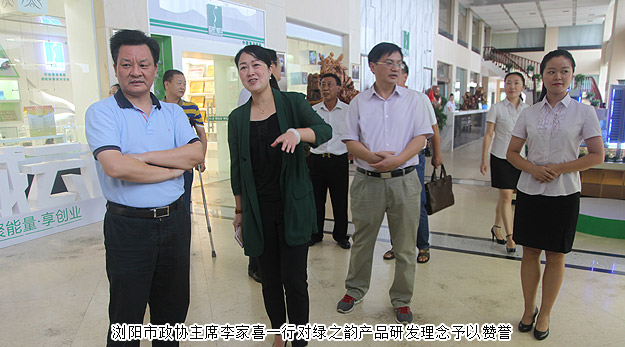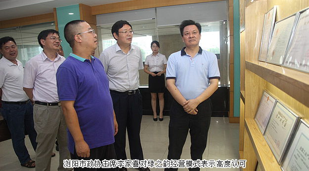 2015年8月18日,瀏陽市政協主席李家喜、瀏陽市政協副主席郭榮華、瀏陽市政協秘書長許百經,瀏陽市發(fā)展和改革局黨組副書記、副局長龍春湘,瀏陽市工業(yè)和信息化局副局長林德懿,瀏陽市工商聯副主席黃萍,瀏陽經濟開發(fā)區(qū)辦公室主任彭衛(wèi)新等一行蒞臨綠之韻集團考察指導。湖南省政協委員、綠之韻集團董事長胡國安,瀏陽市政協常委、綠之韻集團董事常務副總裁勞嘉,綠之韻集團黨總支部書記許達仲,綠之韻集團辦公室主任馮紅等陪同考察。