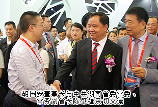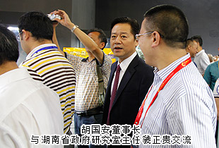 陪同領(lǐng)導(dǎo)巡館以后,胡國(guó)安董事長(zhǎng)對(duì)本次礦博會(huì)成功舉辦高度評(píng)價(jià):“國(guó)際礦博會(huì)的舉辦,讓‘湖南走出去’戰(zhàn)略得到了充實(shí)提升。這么多國(guó)家參展,必將吸引全世界的目光,這對(duì)于湖南文化和湖南經(jīng)濟(jì)社會(huì)來(lái)說(shuō),是一個(gè)天然的展示機(jī)會(huì)。湖南應(yīng)充分利用博覽會(huì)搭建的平臺(tái),‘把會(huì)展與文化、旅游、科技、信息、商貿(mào)、物流更好地結(jié)合起來(lái),著力推動(dòng)會(huì)展經(jīng)濟(jì)和現(xiàn)代服務(wù)業(yè)加快發(fā)展’”。他表示:湖南地處中國(guó)中部城市要沖,無(wú)論是地理位置還是區(qū)位優(yōu)勢(shì)來(lái)看,都是屬于發(fā)展要沖,加上洞庭湖國(guó)家級(jí)生態(tài)經(jīng)濟(jì)區(qū)和長(zhǎng)江經(jīng)濟(jì)帶的確立,更突顯了湖南的發(fā)展優(yōu)勢(shì)。推動(dòng)會(huì)展經(jīng)濟(jì)發(fā)展,這是現(xiàn)代經(jīng)濟(jì)發(fā)展的一個(gè)重要支撐,如果與湖湘文化和大湘西旅游資源及商貿(mào)物流進(jìn)行融合發(fā)展,這就讓湖南經(jīng)濟(jì)具備了強(qiáng)大的內(nèi)生動(dòng)力,為湖南改革開(kāi)放提供了一個(gè)天然的通道和平臺(tái)。所以,我們既要關(guān)注這次郴州礦博會(huì)的盛況,更要與湖南未來(lái)的發(fā)展結(jié)合起來(lái)看,目光不限于一隅,思路才會(huì)天地闊。