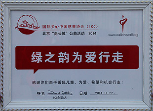 結(jié)束儀式上,綠之韻愛(ài)心志愿者和ICC工作人員、義工們彼此分享了行走過(guò)程中感人的故事和感悟。ICC中國(guó)發(fā)展總監(jiān)吳雙女士為綠之韻愛(ài)心志愿者團(tuán)隊(duì)頒發(fā)了由ICC創(chuàng)始人David Gotts簽名的“走長(zhǎng)城”證書。綠之韻集團(tuán)全球營(yíng)銷中心(中國(guó)區(qū))副總經(jīng)理方彥雄代表集團(tuán)公司發(fā)表了“綠之韻為愛(ài)行走”的感言。