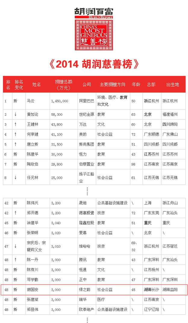 10月28日,《2014胡潤(rùn)慈善榜》正式對(duì)外發(fā)布。在這份榜單當(dāng)中,5家直銷企業(yè)紛紛上榜,綠之韻集團(tuán)位列第4。在本統(tǒng)計(jì)年度中有3位非企業(yè)家身份的慈善家上榜,分別是朱镕基、徐紹村和李春平。前100位上榜慈善家變化巨大,有71位新上榜慈善家,歷年最多。從總體來(lái)看,前100名上榜慈善家中,有18位新的地區(qū)首善;從出生地來(lái)看,有13位新的地方首善誕生。本次包括胡國(guó)安董事長(zhǎng)在內(nèi),湖南僅有兩位企業(yè)家上榜,胡國(guó)安董事長(zhǎng)捐贈(zèng)3000萬(wàn)元,位列第48位。阿里巴巴的馬云以145億元捐贈(zèng)額刷新中國(guó)慈善記錄,成為新一屆“中國(guó)最慷慨的慈善家“;世紀(jì)金源的黃如論以5.8億元的捐贈(zèng)額排名第二;60歲的王健林以4.4億元的捐贈(zèng)額位列第三。