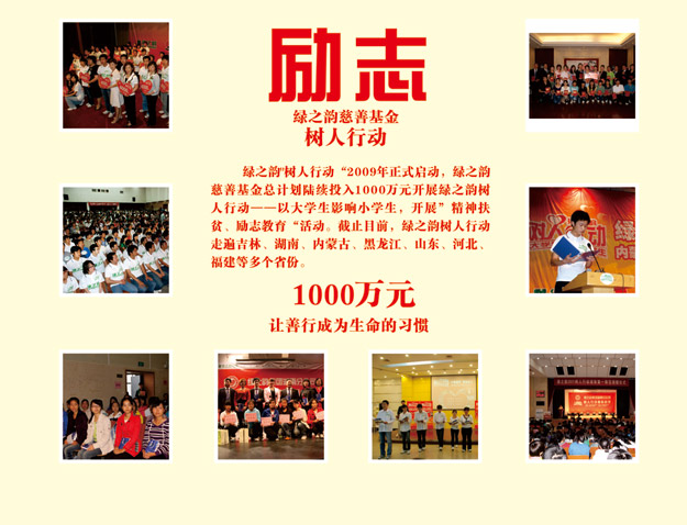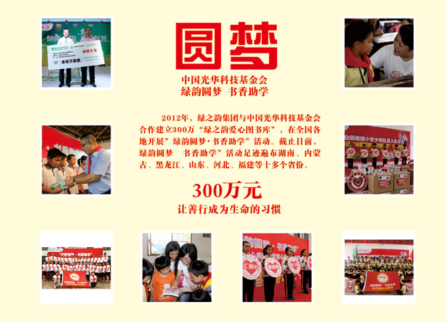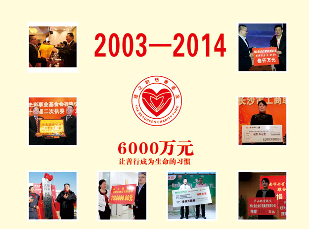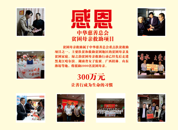 今年是胡潤(rùn)慈善榜十周年,同時(shí)也是綠之韻集團(tuán)成立的第十一個(gè)年頭。十一年來(lái),綠之韻集團(tuán)在胡國(guó)安董事長(zhǎng)帶領(lǐng)下,踴躍參與和傾情捐助了教育、關(guān)愛老人、賑災(zāi)、扶貧、幫困等多項(xiàng)社會(huì)慈善事業(yè),用實(shí)際行動(dòng)履行著企業(yè)應(yīng)盡的責(zé)任和義務(wù),如:在全國(guó)各地先后援建了10所希望小學(xué)、陸續(xù)投入1000萬(wàn)元開展“樹人行動(dòng)”、投入300萬(wàn)元在全國(guó)各地開展“綠韻圓夢(mèng)?書香助學(xué)”活動(dòng)、向湖南省光彩事業(yè)基金捐贈(zèng)3000萬(wàn)元促進(jìn)“老、少、邊、窮”地區(qū)的經(jīng)濟(jì)發(fā)展和社會(huì)進(jìn)步、捐資300萬(wàn)專項(xiàng)扶貧基金開展“關(guān)愛貧困母親”行動(dòng)。截止目前,綠之韻集團(tuán)已累計(jì)捐贈(zèng)款物達(dá)6000多萬(wàn)元,贏得了社會(huì)各界的廣泛關(guān)注和好評(píng)。2014年9月23日,中華慈善總會(huì)成立20周年紀(jì)念會(huì)在北京舉行,綠之韻集團(tuán)被光榮授予“中國(guó)慈善突出貢獻(xiàn)獎(jiǎng)“。