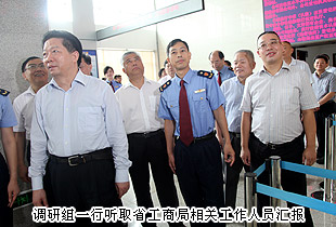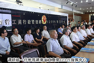 在湖南省工商局黨組書記、局長李金冬的陪同下,調(diào)研組一行首先來到湖南省工商行政管理局12315指揮中心聽取了關(guān)于湖南工商12315指揮系統(tǒng)的工作匯報(bào)。湖南工商12315指揮系統(tǒng)是工商機(jī)關(guān)受理消費(fèi)者申訴舉報(bào),調(diào)解消費(fèi)糾紛,查處侵權(quán)案件,加強(qiáng)市場監(jiān)督的維權(quán)熱線,分為大屏幕拼接顯示墻系統(tǒng)、LED顯示屏系統(tǒng)和可視調(diào)度指揮系統(tǒng)等三個(gè)子系統(tǒng)。采用高清晰數(shù)字顯示、多屏圖像處理、網(wǎng)絡(luò)技術(shù)等科技手段,為12315指揮調(diào)度提供了網(wǎng)絡(luò)監(jiān)控、信息共享、數(shù)據(jù)分析和業(yè)務(wù)保障的綜合平臺(tái)。湖南省政協(xié)主席陳求發(fā)指出,一定不斷加強(qiáng)和改進(jìn)消費(fèi)維權(quán)工作,不斷拓展維權(quán)功能,努力把12315打造成經(jīng)濟(jì)領(lǐng)域的“110”,化解矛盾的“接訪點(diǎn)”,消費(fèi)維權(quán)的“保護(hù)神”,工商形象的“展示窗”。