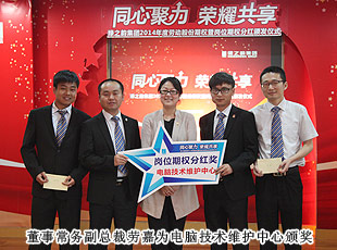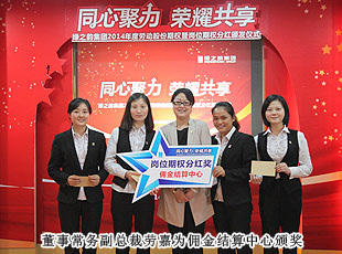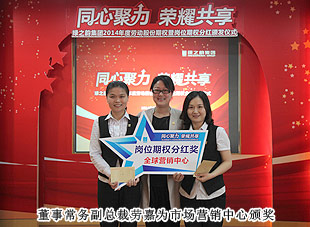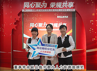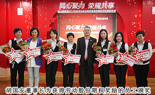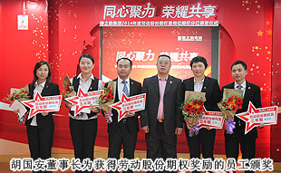 通過學習和借鑒,適時引入“勞動股份期權”這一前瞻性概念,并付諸于一諾千金的主動性企業(yè)行為,是綠之韻在其發(fā)展過程中區(qū)別于其他企業(yè)的顯著標志,也是本次頒獎大會上最重大的亮點。“綠之韻模式”的勞動股份期權獎勵機制,始于2011年,分為勞動股份期權(三年期)和勞動股份期權(五年期)兩種形式,兌付方式分為一次性兌付和逐年兌付兩種方式,開創(chuàng)了直銷企業(yè)主動將企業(yè)價值與普通員工共享的里程碑式先河。在全場熱烈的掌聲中,胡國安董事長親自為獲得2014年勞動股份期權獎勵的員工頒發(fā)了獎勵,并逐一合影留念。