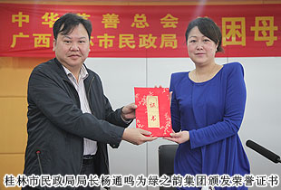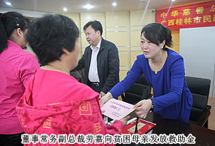 2014年4月11日,“關愛貧困母親,讓愛綻放”——中華慈善總會貧困母親救助綠之韻愛心行動第三站走進廣西桂林,為100名特困母親捐贈20萬元愛心善款。中華慈善總會秘書長邊志偉、募捐部主任蘇輝、廣西慈善總會常務副會長陳利丹、秘書長陳克富等領導出席活動。綠之韻集團董事常務副總裁勞嘉、全球營銷中心華南區(qū)業(yè)務總監(jiān)兼廣東分公司經(jīng)理梁涌帶領吳季峰、葉海蘭、楊帆等綠之韻愛心志愿者為愛行動。