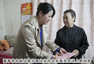貧困母親蔣美榮,去年12月被檢查出患有惡性腦腫瘤,喪失勞動力。丈夫2002年因車禍去世,獨自撫養(yǎng)還只念初一的雙胞胎女兒,一家人擠在一間30多平方徒有四壁的小房子里,沒有經(jīng)濟來源,只能靠社區(qū)的救濟,巨額的手術化療費用和女兒的學雜費用,讓這個家陷入絕境……看到這一切,綠之韻集團董事常務副總裁勞嘉說:我的心就像被緊緊地揪在一起,生生地疼,我們現(xiàn)在能做的和以后要做的,就是讓企業(yè)強大,讓社會參與,共同扶貧濟困。說完這番話,只見她偷偷抹掉眼角的淚水,微笑著為這個家送上了慰問金和救助物資。