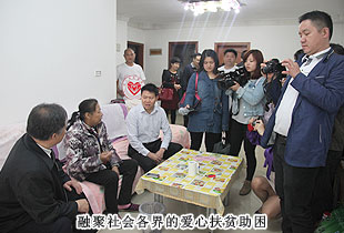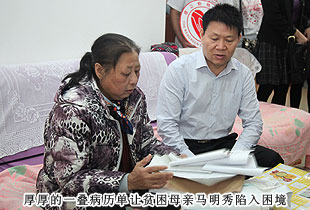 貧困母親馬明秀,患有尿毒癥,丈夫同樣身體抱病,一摞厚厚的病歷單成為這個家庭最刺眼的標簽。桌子上各種各樣的藥罐子,是每月2000多醫(yī)療費用的產(chǎn)物,當失去了經(jīng)濟來源,生的希望就無情地熄滅了。可是,當迎來慰問隊伍,收到各界的關懷之后,馬明秀說:“我曾經(jīng)失去過活下去的勇氣,但是社會各界的關心,讓我又擁有了對抗病魔的勇氣,我一定會好好活下去,帶給家人和社會精神上的正能量?!?br/>