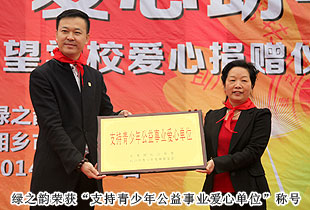 揭牌儀式上,月山鎮(zhèn)學(xué)校的學(xué)生們向出席儀式的綠之韻集團(tuán)愛心人士敬獻(xiàn)了紅領(lǐng)巾。全球營銷中心(中國區(qū))副總經(jīng)理劉維利代表綠之韻慈善基金遞交30萬元愛心捐贈(zèng)支票,長沙市青基會(huì)理事長羊舒麟接受捐贈(zèng),并授予綠之韻“支持青少年公益事業(yè)愛心單位”牌匾。共青團(tuán)湘潭市委書記白云峰與綠之韻集團(tuán)胡國安董事長共同為希望學(xué)校揭牌,并向胡國安董事長頒發(fā)了愛心企業(yè)家榮譽(yù)牌匾,各級(jí)領(lǐng)導(dǎo)嘉賓與愛心經(jīng)銷商代表全程見證。