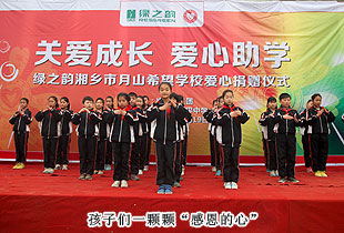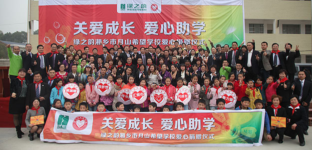 2014年3月19日,由共青團(tuán)長沙市委、長沙市青基會(huì)牽頭,綠之韻集團(tuán)出資30萬元建設(shè)的第九所希望學(xué)?!熬G之韻湘鄉(xiāng)市月山鎮(zhèn)希望學(xué)?!痹诤舷驵l(xiāng)市揭牌成立。共青團(tuán)湘潭市委書記白云峰、共青團(tuán)長沙市委副書記詹萍萍、湘鄉(xiāng)市人大常委會(huì)黨組副書記、副主任王建湘、長沙市青基會(huì)理事長羊舒麟、月山鎮(zhèn)常務(wù)副鎮(zhèn)長徐慧湘等十幾位領(lǐng)導(dǎo)嘉賓出席,綠之韻集團(tuán)董事長胡國安、全球營銷中心(中國區(qū))副總經(jīng)理劉維利、湖南分公司經(jīng)理張薇與200多位綠之韻愛心經(jīng)銷商共同為愛傳承,為孩子們送上如春天般的融融暖意。