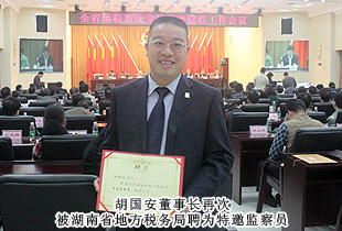自2008年受聘,2011年連任湖南省地稅局特邀監(jiān)查員以來,胡國安董事長始終認(rèn)真履行職責(zé),了解和反映基層稅務(wù)部門和稅務(wù)人員依法治稅、依法行政的情況,在解決群眾關(guān)心的熱點(diǎn)難點(diǎn)問題,促進(jìn)行風(fēng)政風(fēng)建設(shè)方面取得了矚目的成績,得到了地稅系統(tǒng)領(lǐng)導(dǎo)的高度肯定和一致好評(píng)。此次會(huì)議,胡國安董事長再一次被聘為特邀監(jiān)察員,成為唯一一位連續(xù)兩次受聘連任湖南省地稅局特邀監(jiān)察員的企業(yè)家。