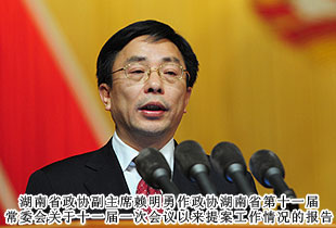 上午9時(shí)整,湖南省政協(xié)副主席武吉海宣布大會(huì)開(kāi)幕,全體人員齊唱雄壯的國(guó)歌。湖南省政協(xié)主席陳求發(fā)代表十一屆省政協(xié)常委會(huì)作工作報(bào)告。陳求發(fā)指出,2014年是深入貫徹落實(shí)中共十八屆三中全會(huì)精神、全面深化改革的第一年,也是全面推進(jìn)我省政協(xié)工作的重要一年。今年省政協(xié)工作的指導(dǎo)思想是:高舉中國(guó)特色社會(huì)主義偉大旗幟,堅(jiān)持團(tuán)結(jié)民主兩大主題,在中共湖南省委的領(lǐng)導(dǎo)下,堅(jiān)持穩(wěn)中求進(jìn)、改革創(chuàng)新,緊緊圍繞“兩個(gè)加快、兩個(gè)率先”總目標(biāo),落實(shí)“三量齊升”總要求,實(shí)施“四化兩型”總戰(zhàn)略,突出分類(lèi)指導(dǎo)建小康總抓手,做到“準(zhǔn)確定好位、履職不缺位、盡職不越位、工作做到位”,忠實(shí)履職,奉獻(xiàn)湖南,為推進(jìn)我省經(jīng)濟(jì)、政治、文化、社會(huì)和生態(tài)文明建設(shè)作出新的貢獻(xiàn)。他號(hào)召全體省政協(xié)委員緊密地團(tuán)結(jié)在以習(xí)近平同志為總書(shū)記的中共中央周?chē)谥泄埠鲜∥念I(lǐng)導(dǎo)下,同心同德,群策群力,同心共創(chuàng)湖南美好明天!