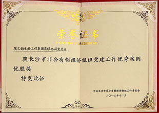 2013年12月25日,毛澤東同志誕辰120周年紀念日前一天,綠之韻集團黨總支部光榮地被中共長沙市非公有制經(jīng)濟組織工作委員會授予“長沙市非公有制經(jīng)濟組織黨建工作優(yōu)秀案例優(yōu)勝單位”稱號,其先進事跡和黨建工作經(jīng)驗成功入選《長沙市非公有制經(jīng)濟組織黨建工作優(yōu)秀案例匯編《領(lǐng)航》一書,在全市范圍內(nèi)進行宣傳推廣。