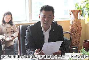 會上,綠之韻集團(tuán)總裁助理方彥雄組織全員學(xué)習(xí)了《中國共產(chǎn)黨第十八屆中央委員會第三次全體會議公報》原文,詳細(xì)介紹了十八屆三中全會召開的背景、時間、指導(dǎo)思想、總體目標(biāo)、重點任務(wù),進(jìn)一步明確了黨的十八屆三中全會是在我國改革開放新的重要關(guān)頭召開的一次重要會議,是全面深化改革的又一次總部署、總動員,具有重大而深遠(yuǎn)的影響。